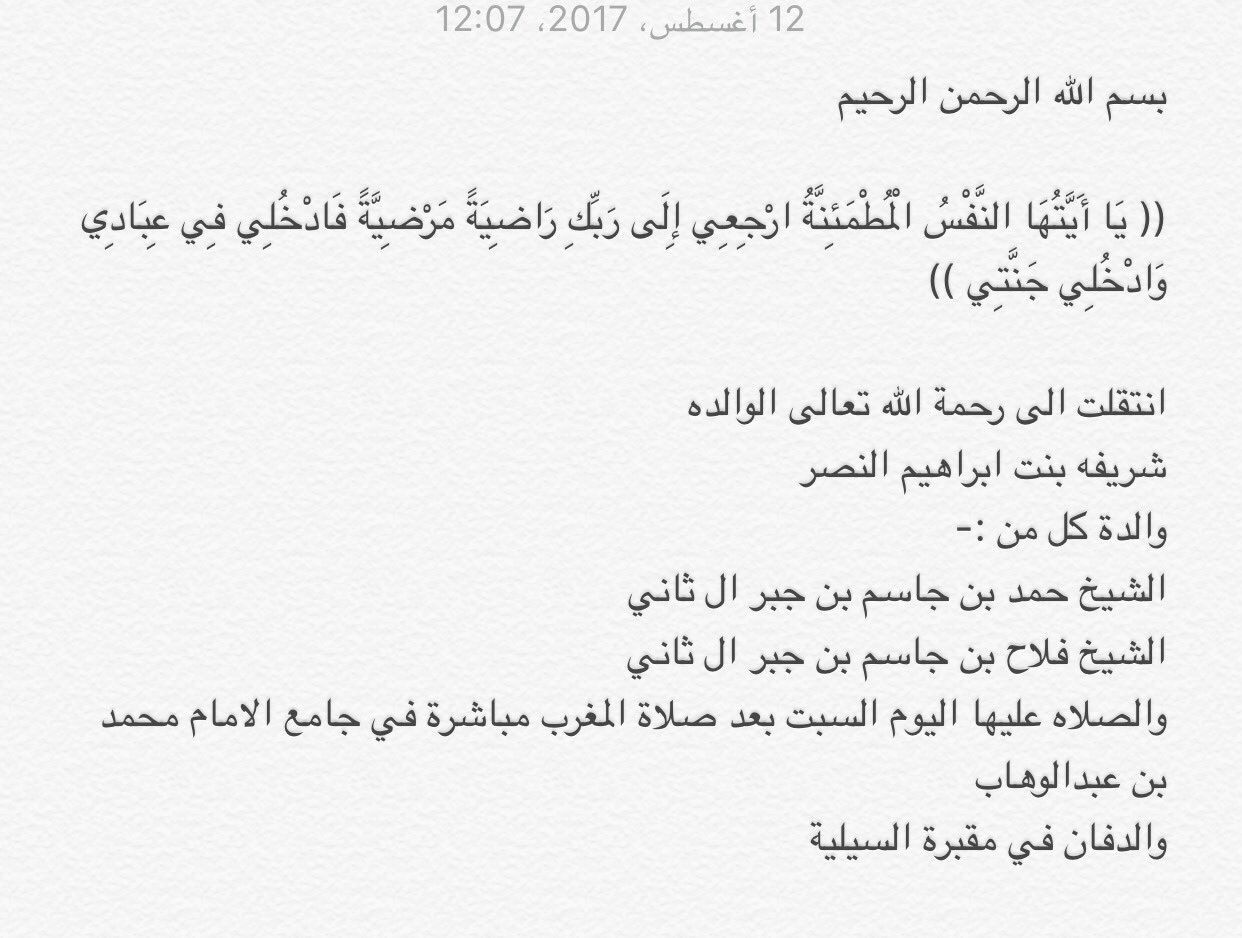 تميم آل ثاني A Twitter انتقلت الى رحمة الله الوالدة شريفه النصر والدة الشيخ حمد بن جاسم بن جبر والشيخ فلاح الصلاة عليها المغرب في جامع الامام محمد بن عبدالوهاب Https T Co Kxqsgz0rqs