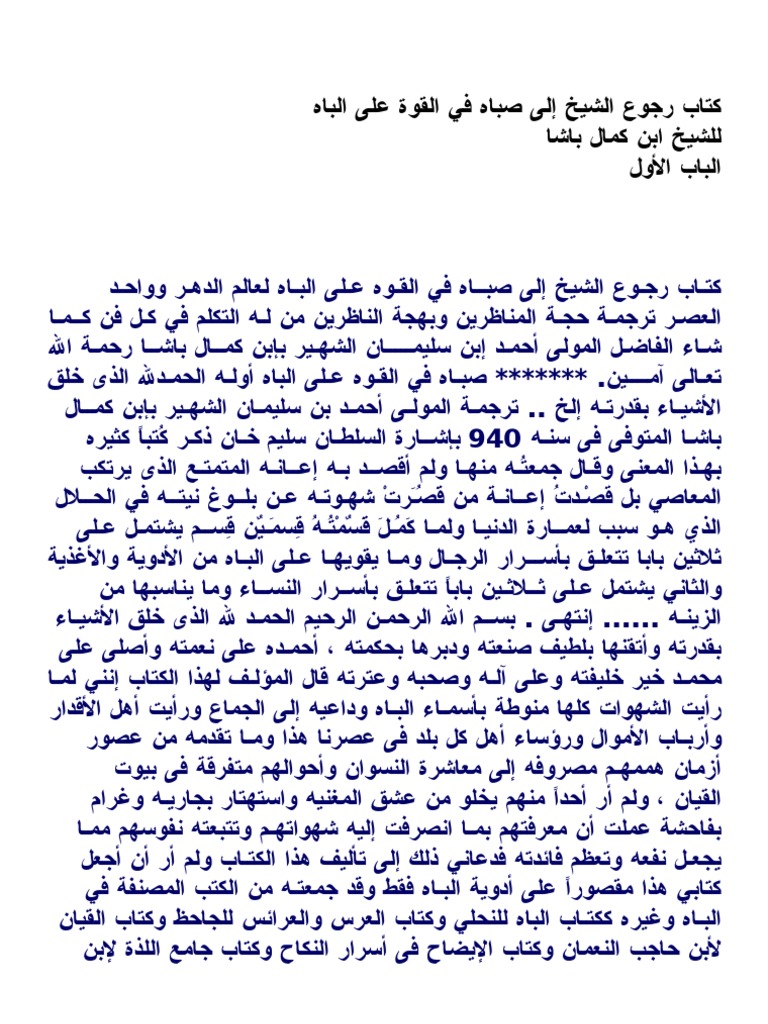 كتاب رجوع الشيخ الى صباه. كتاب رجوع الشيخ إلى صباه في القوة على الباه هو مؤلف للامام أحمد بن سليمان بن كمال باشا قام بتأليفه باشارة من السلطان سليم الأول وأتم طباعته في سنة 903 هـ. كتاب رجوع الشيخ إلى صباه في القوة على الباه هو مؤلف للامام أحمد بن سليمان بن كمال باشا قام بتأليفه باشارة من السلطان سليم الأول وأتم طباعته في سنة 903 هـ. كتاب رجوع الشيخ الى صباه بالقوة على الباه هو مؤلف للامام احمد بن سليمان بن كمال باشا قام بتاليفه باشارة من السلطان سليم الاول و اتم طباعته بسنة 903 ه.