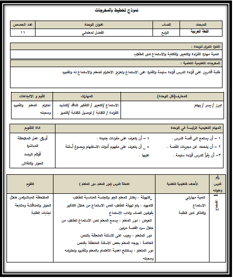 نموذج تحضير درس لغة عربية للصف الرابع الابتدائى
