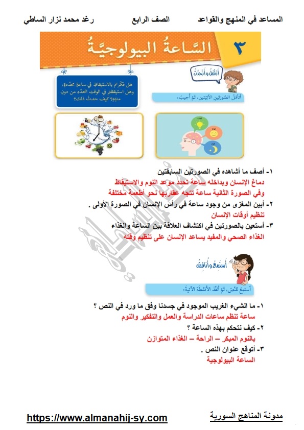 حل وشرح درس الساعة البيولوجية في اللغة العربية للصف الرابع الفصل الاول
